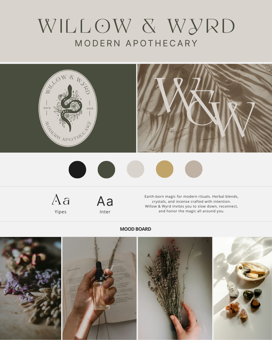 For Willow & Wyrd, I created a brand rooted in ritual, earth-born ingredients, and mystical storytelling — perfect for apothecaries, skincare lines, or lifestyle boutiques.